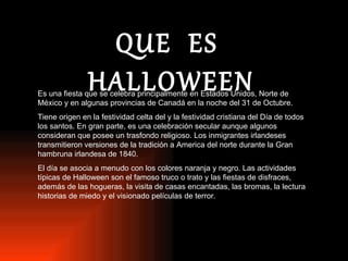 Este documento resume la historia y las tradiciones de Halloween. Comenzó como una festividad celta llamada Samhain que marcaba el final del verano. Con la llegada del cristianismo, se convirtió en una celebración de los santos y los difuntos. Tradiciones como el "truco o trato" y tallar calabazas se originaron de leyendas celtas sobre espíritus malignos. Hoy en día, Halloween es una de las festividades más populares en países anglosajones y se centra en disfraces, dulces y pelí