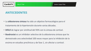 Este documento resume los resultados de un ensayo clínico de fase 2 que evaluó la eficacia y seguridad de baxdrostat, un inhibidor selectivo de la aldosterona sintasa, en pacientes con hipertensión no controlada. El ensayo no logró su objetivo primario de mostrar una mayor reducción de la presión arterial sistólica con baxdrostat frente a placebo. Sin embargo, baxdrostat redujo los niveles de aldosterona de forma segura y fue bien tolerado.