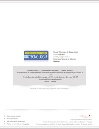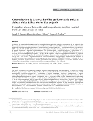 Este documento describe el aislamiento y caracterización de bacterias halófilas productoras de amilasas de las Salinas de San Blas en Perú. De 34 bacterias aisladas, el 41% mostró actividad amilolítica. Catorce bacterias amilolíticas fueron caracterizadas fenotípicamente y molecularmente, identificándose dos grupos: tres bacterias pertenecientes al género Halomonas y once al género Bacillus. Las bacterias caracterizadas podrían tener aplicaciones industriales debido a su capacidad para producir amil
