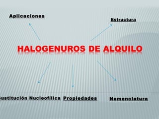 Este documento resume las propiedades y reacciones de los haluros de alquilo. Explica que los haluros de alquilo son líquidos incoloros y solubles en agua que se descomponen con la luz. Reaccionan con bases para formar alcoholes u alquenos. También describe las sustituciones nucleófilas SN1 y SN2, señalando que SN1 es uniprocesal mientras que SN2 es bimolecular y estereoespecífica. Finalmente, menciona algunas aplicaciones como disolventes, anestésicos y plagu