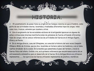 El levantamiento de pesas tiene su origen en actividades diarias de la antigüedad como levantar rocas o animales. En la antigua Grecia se practicaba con implementos de piedra y metal. Actualmente hay competiciones para hombres y mujeres divididas en categorías por peso. Los movimientos evaluados son el arranque y el envión, realizados con técnica y posición correctas para ser validados por 3 jueces.
