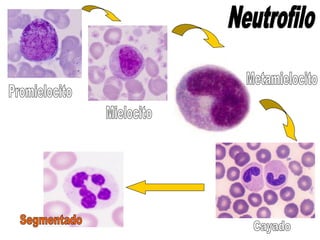 Este documento trata sobre la hematopoyesis y la formación de diferentes tipos de células sanguíneas como neutrófilos, eosinófilos y basófilos a partir de células madre en la médula ósea. Explica las etapas de mielopoyesis, linfopoyesis y los compartimentos celulares en la médula ósea, así como la cinética de una infección y la reacción leucemoide. También aborda temas como la mononucleosis infecciosa y aspectos del ciclo celular como las f