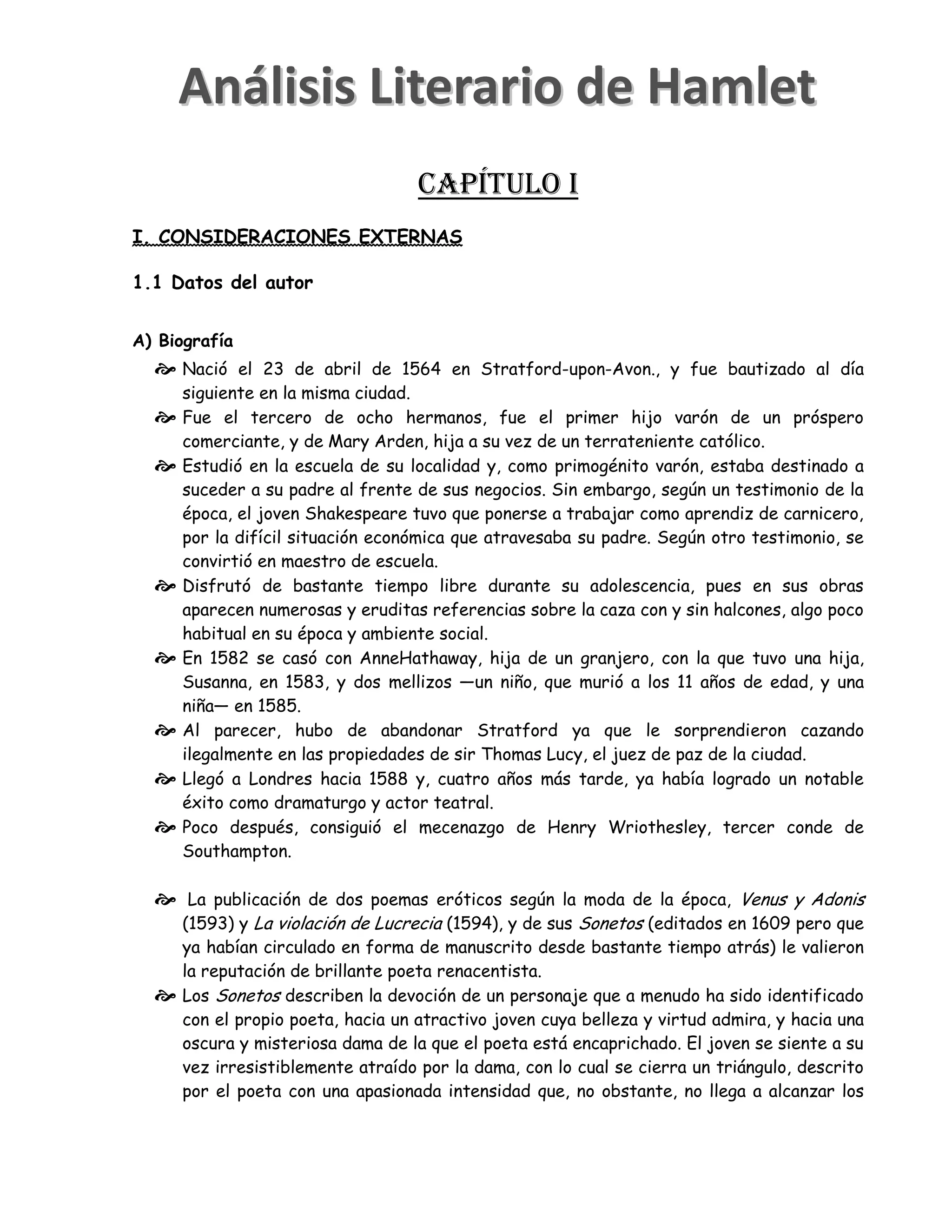La obra describe la biografía de William Shakespeare y el contexto histórico y literario en el que escribió. Shakespeare nació en 1564 en Inglaterra y se destacó como dramaturgo y poeta durante el Renacimiento. Escribió 38 obras teatrales, así como poemas y sonetos. La obra Hamlet, publicada entre 1599-1601, es una tragedia que cuenta la historia de Hamlet y su venganza contra su tío por asesinar a su padre.