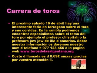 Los estudiantes Hamza y Mehdi presentan dos eventos: una feria sobre toros en Tarragona el 16 de abril con especialistas como el profesor Chispitah, y comparten su número de teléfono y página web para más información; también comparan las salamandras y las sargantanas, indicando que ambas son animales listos que salen de noche a cazar o pescar mosquitos.