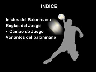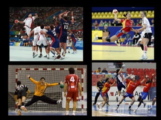 El documento proporciona una historia del balonmano. Se origina en juegos antiguos griegos y se desarrolla formalmente en el siglo XIX en Dinamarca. Las reglas establecen un campo rectangular y porterías, y el objetivo es anotar tantos pasando el balón con las manos. Existen variantes como el balonmano playa y el mini handball para niños.