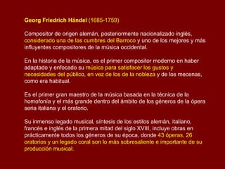 Georg Friedrich Händel fue un compositor alemán del Barroco que destacó principalmente en el género de la ópera y el oratorio. Nació en 1685 en Alemania y pasó gran parte de su carrera en Inglaterra, donde compuso obras célebres como El Mesías y la música para el encendido de fuegos artificiales del rey Jorge II. Händel produjo más de 600 obras que abarcaron todos los géneros musicales de su época, incluyendo 43 óperas, 26 oratorios y cientos de cantatas e