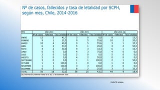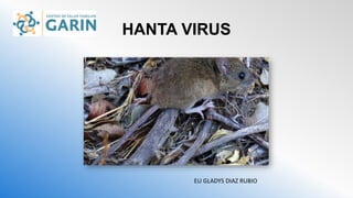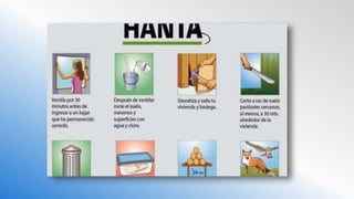El documento proporciona información sobre el virus Hanta, una zoonosis viral transmitida por roedores que puede ser potencialmente mortal para los humanos. El virus se transmite principalmente a través de la inhalación de aerosoles generados por la orina y heces de roedores infectados, como el ratón de cola larga. Los síntomas incluyen fiebre, dolor muscular y dificultad respiratoria. No existe tratamiento específico, y la letalidad varía entre el 30-50%. La prevención incluye medidas de higiene para evitar la