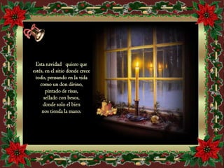 Este poema navideño desea una feliz navidad a los amigos en Slideshare. Celebra el nacimiento de Jesús y la magia de la inocencia infantil en esta noche especial. Invita a todos a festejar juntos la paz y el amor en esta época, ofreciendo su hogar a cualquiera que se sienta solo.
