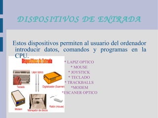 El documento divide el hardware en tres tipos de dispositivos: dispositivos de entrada como el teclado y el mouse que permiten introducir datos; dispositivos de salida como la pantalla y la impresora que muestran los resultados; y dispositivos de almacenamiento como la memoria RAM interna, el disco duro y los discos ópticos que almacenan datos e instrucciones de manera temporal o permanente.