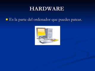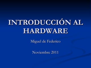 El documento proporciona una introducción al hardware de los ordenadores. Explica que el hardware incluye los dispositivos de entrada y salida, la unidad central de procesamiento y sus componentes principales como la placa base, la memoria RAM, el procesador y la tarjeta gráfica. También describe otros componentes como la fuente de alimentación, la caja y el sistema de refrigeración, y cómo estos afectan al rendimiento y uso del ordenador.