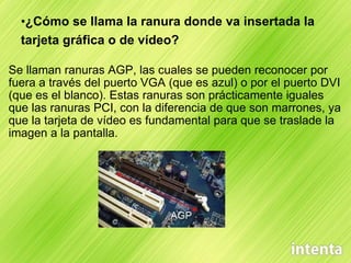La ranura donde se inserta la tarjeta gráfica se llama ranura AGP. Estas ranuras, al igual que las ranuras PCI, permiten insertar tarjetas adicionales como sonido, wifi y TV. Un ordenador tiene como mínimo dos ventiladores, uno en la fuente de alimentación y otro en el microprocesador.