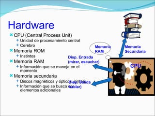 El documento describe los principales componentes de hardware de un computador, incluyendo la CPU, memoria (RAM, ROM), almacenamiento (disco duro, disquete), monitor, tarjeta de video y otros dispositivos. También explica conceptos como bytes, kilobytes, megabytes y terabytes para describir el almacenamiento. Finalmente, detalla dispositivos de entrada como teclado y mouse, y de salida como monitor, impresora y bocinas.