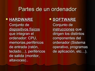 Este documento describe los principales componentes hardware de un ordenador, incluyendo la caja, placa base, memoria RAM, procesador, disco duro, unidades ópticas, puertos y tarjetas de expansión. Explica las funciones de cada parte y cómo se conectan entre sí para formar un sistema operativo completo.