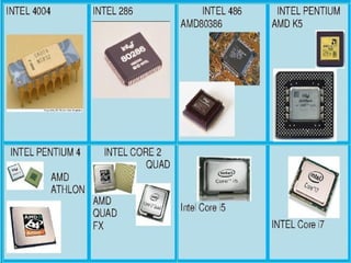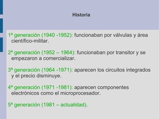 La historia de los ordenadores se divide en 5 generaciones desde 1940 hasta la actualidad, donde en cada generación se introducen mejoras en los componentes electrónicos como los circuitos integrados y el microprocesador. El hardware se refiere a la parte física del ordenador e incluye componentes como la placa base, la memoria y el microprocesador. El software se refiere a la parte lógica y comprende programas de sistema operativo, aplicaciones y programación.