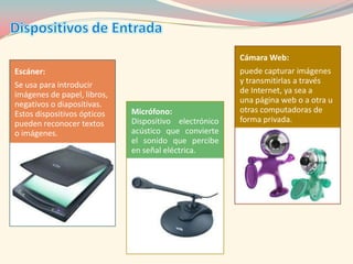 El documento define los componentes hardware de una computadora y los divide en dispositivos de entrada, salida y mixtos. Los dispositivos de entrada incluyen teclados, mouse, escáneres y micrófonos que permiten ingresar datos. Los dispositivos de salida son monitores, impresoras y bocinas que exteriorizan la información. Los dispositivos mixtos como lectores CD/DVD, discos duros y memorias USB pueden usar para entrada y salida de datos.