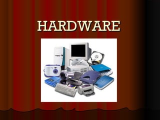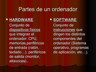 El documento describe los principales componentes hardware de un ordenador. Explica que estos incluyen la caja, la placa base, la memoria RAM, el procesador, la fuente de alimentación, los discos duros, las unidades ópticas y las tarjetas de expansión como las gráficas y de red. También describe brevemente el funcionamiento de estos componentes y sus características.