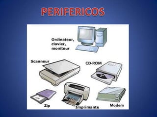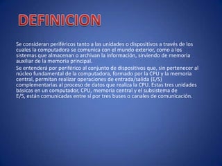 Los periféricos son dispositivos externos que permiten la entrada y salida de datos a la computadora y su interacción con el mundo exterior. Incluyen dispositivos de entrada como teclados, ratones y escáneres; dispositivos de salida como pantallas, impresoras y bocinas; y dispositivos de almacenamiento como discos duros y unidades USB. A pesar de no ser componentes fundamentales, los periféricos son elementos importantes para la función de un sistema informático.