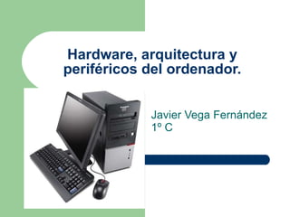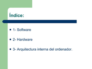 El documento habla sobre el software, hardware y arquitectura de un ordenador. Explica que el software incluye sistemas operativos, programas de aplicación como procesadores de texto y hojas de cálculo. El hardware son las partes físicas como la unidad central de procesamiento, memoria, periféricos de entrada/salida. La arquitectura interna incluye la placa base, tarjetas de expansión y fuente de alimentación.