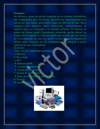 El documento habla sobre el hardware y software de una computadora. Define el hardware como las partes físicas y tangibles de un sistema como el monitor, placa base, CPU, memoria RAM y periféricos. Luego describe los componentes típicos de hardware de una PC. Explica que el software se clasifica en sistemas operativos, lenguajes de programación y aplicaciones. Define los sistemas operativos como el gestor de las actividades de la computadora y los lenguajes de programación como las instrucciones para indicarle tareas a la computadora. Finalmente, menciona