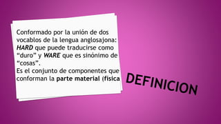 El hardware de una computadora se refiere a los componentes físicos o materiales que la conforman y puede dividirse en internos como la placa base, procesador y memoria RAM, y externos como monitor, teclado y mouse.