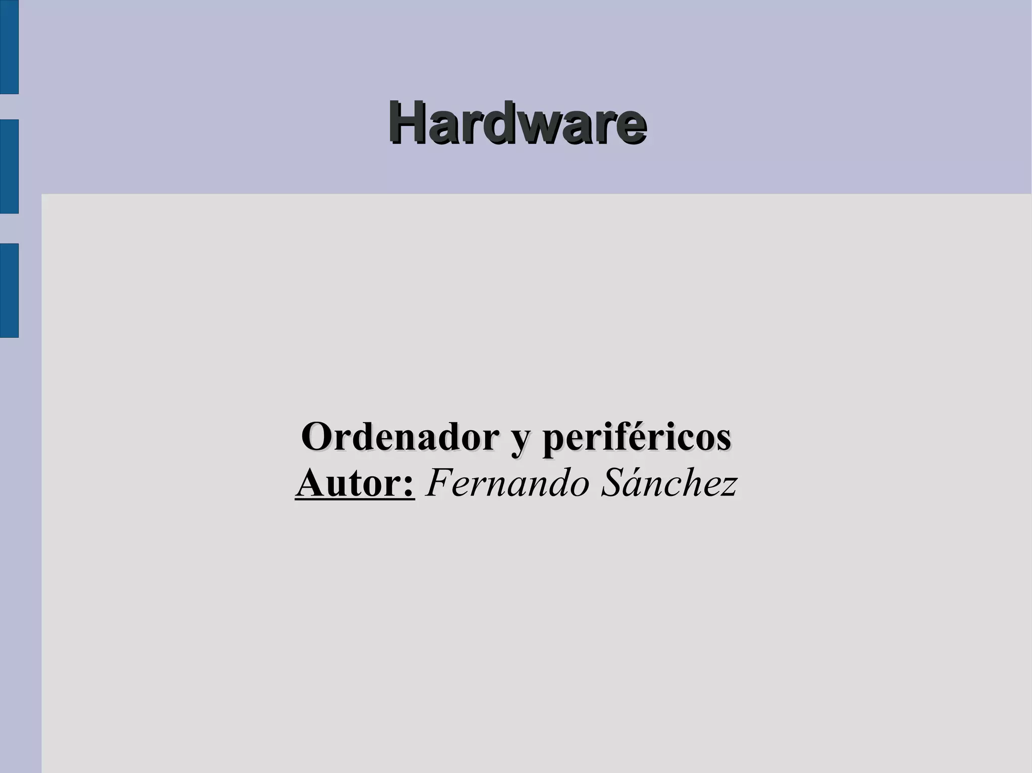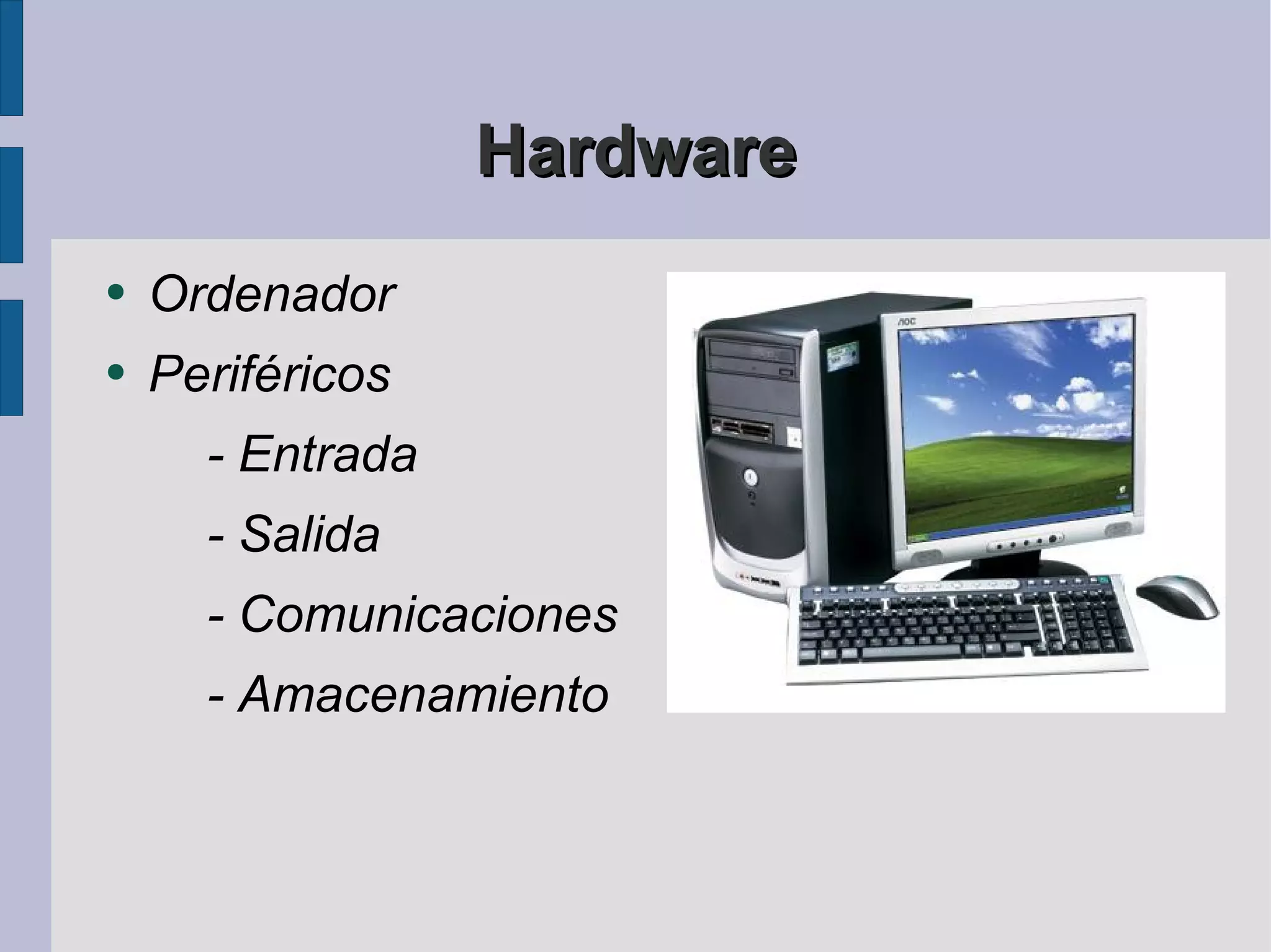 El documento habla sobre los componentes básicos de hardware de un ordenador incluyendo la placa base, el procesador y la memoria como parte central del ordenador, así como periféricos de entrada, salida, comunicaciones y almacenamiento.