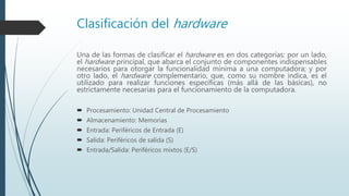 El documento describe los diferentes tipos de hardware de un sistema informático. Explica que el hardware se puede clasificar en principal y complementario. El hardware principal incluye la unidad central de procesamiento, la memoria y los periféricos de entrada y salida. La unidad central de procesamiento ejecuta instrucciones y procesa datos, mientras que la placa base conecta y comunica los diferentes componentes. Los periféricos permiten la entrada y salida de información al sistema.