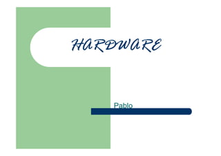 El documento define el hardware como los componentes físicos de un PC como cables, ratón y monitor, a diferencia del software que son las partes no tangibles como programas y datos. Explica que el hardware básico son componentes necesarios como la RAM y CPU, mientras que el hardware complementario sirve para funciones específicas como puertos USB. Además, los periféricos permiten funciones de entrada/salida y el hardware gráfico se compone principalmente de tarjetas gráficas que alivian la carga de procesamiento de imágenes y video para el procesador