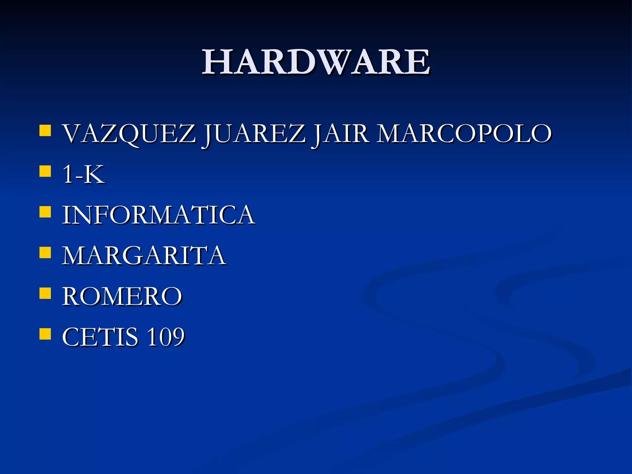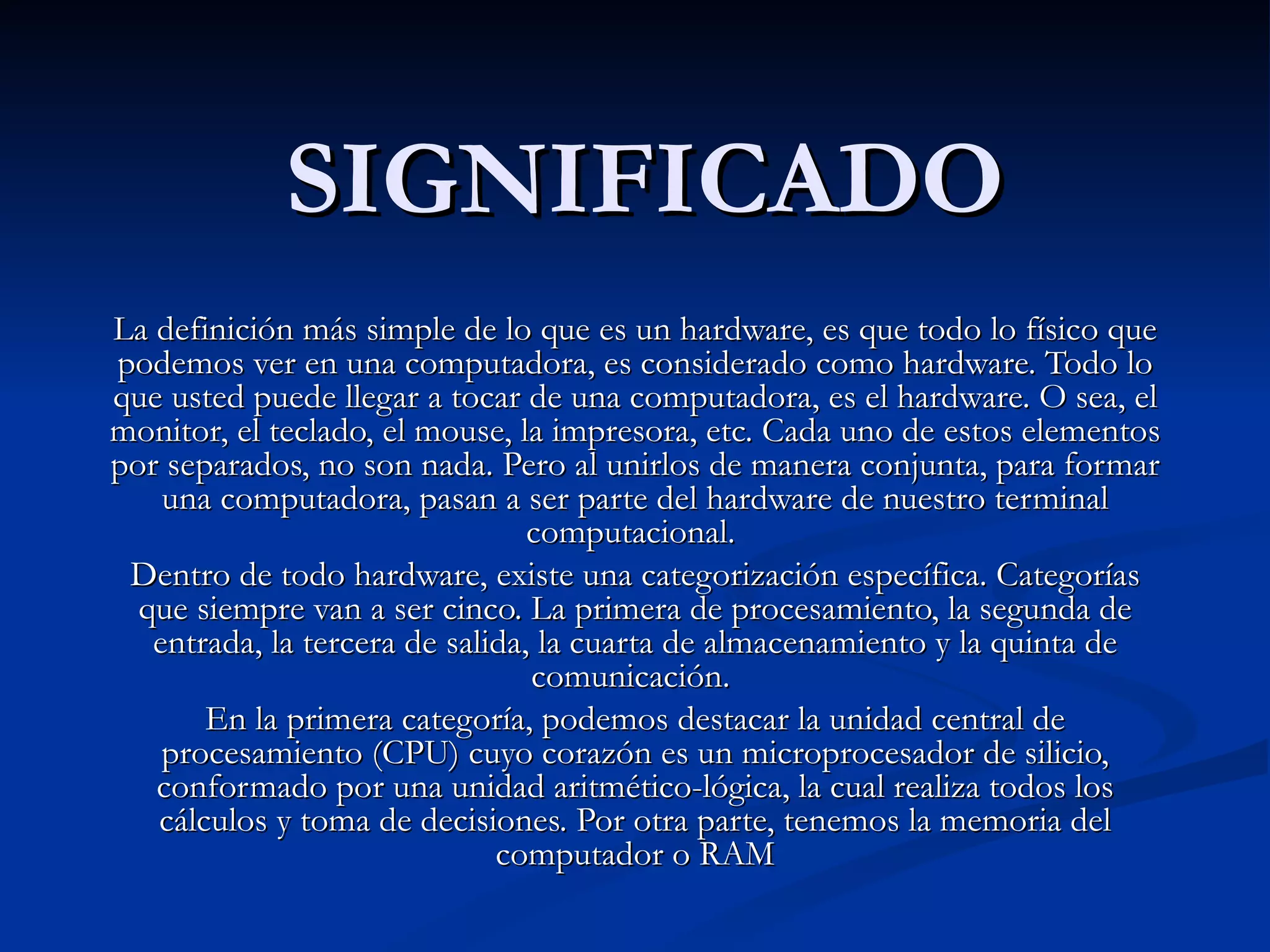 El documento habla sobre el hardware de una computadora. Define hardware como los componentes físicos que se pueden ver como el monitor, teclado, mouse, impresora. Explica que existen cinco categorías de hardware: procesamiento, entrada, salida, almacenamiento y comunicación. Describe algunos componentes clave como la CPU, memoria RAM, teclado, mouse, monitor e impresora.