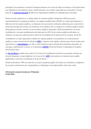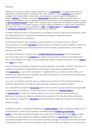 El hardware se refiere a las partes físicas de una computadora como sus componentes electrónicos, cables y gabinetes. El hardware básico incluye la unidad central de procesamiento, memoria, medios de entrada y salida, y almacenamiento, mientras que el hardware complementario realiza funciones específicas. Las tarjetas gráficas constituyen el hardware gráfico y contienen su propia memoria y unidad de procesamiento gráfico para procesar operaciones gráficas.