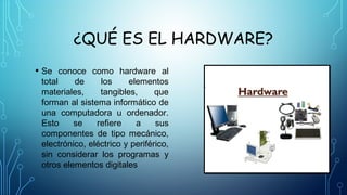 El documento clasifica y divide el hardware de una computadora. Explica que el hardware son los componentes físicos y tangibles del sistema, como los periféricos de entrada (teclado, mouse), salida (monitor, impresora) y entrada/salida (CD, DVD). Además, divide el hardware en básico (unidad central de procesamiento, tarjeta madre, memoria) y complementario (ratón, USB, impresora).
