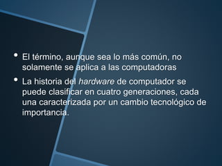 El documento describe las cuatro generaciones de hardware de computadoras, desde la primera generación basada en tubos de vacío hasta la cuarta generación futura basada probablemente en un nuevo material. También clasifica el hardware en básico y complementario, e identifica los principales componentes de un sistema informático como la CPU, memoria, y periféricos de entrada, salida y mixtos.