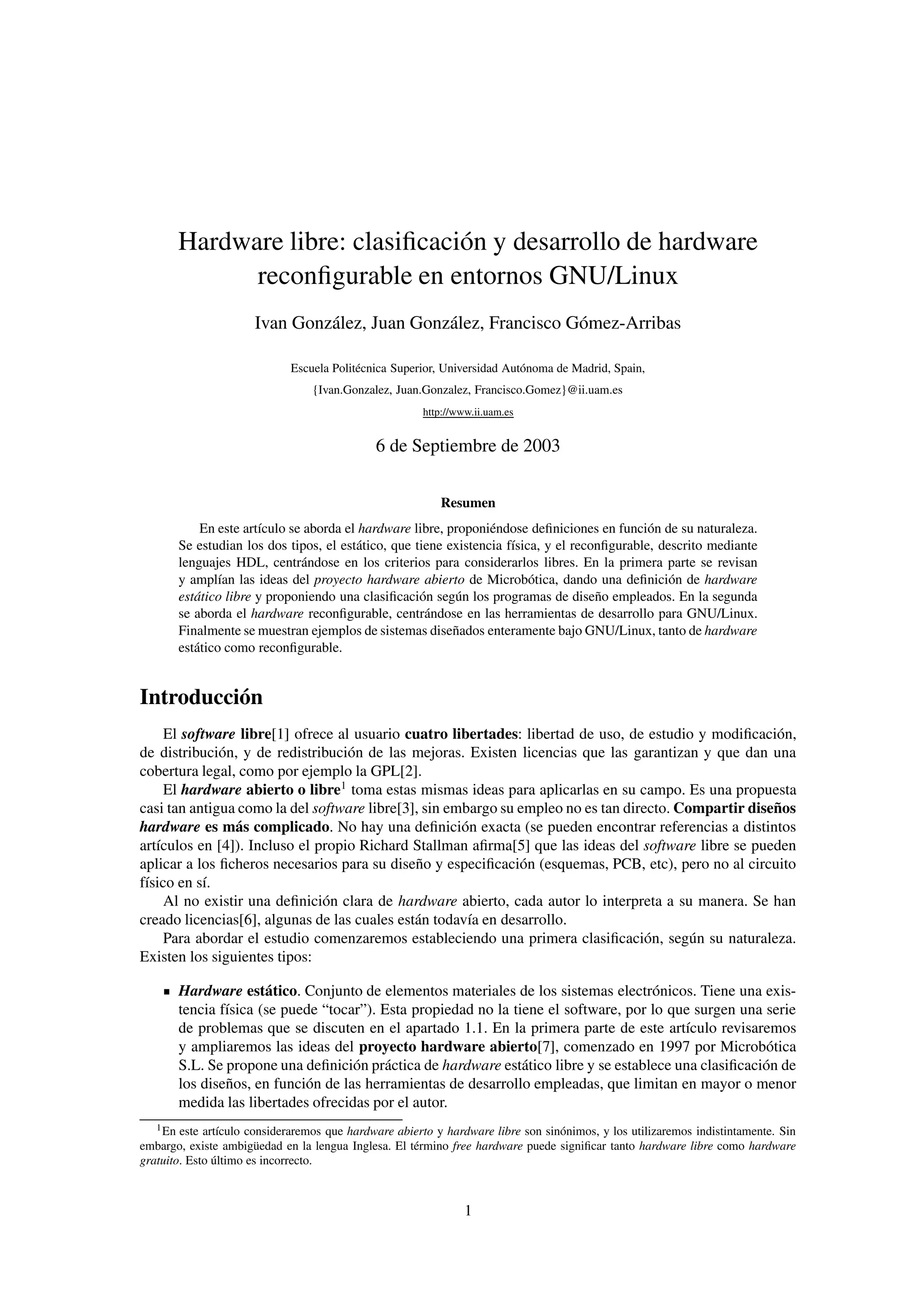 Este documento describe el hardware libre, proponiendo definiciones y clasificaciones. Se discuten dos tipos de hardware: estático, que tiene existencia física, y reconfigurable, descrito mediante lenguajes HDL. Para el hardware estático, se propone que sea considerado libre si ofrece las cuatro libertades del software libre en los planos (esquemático, PCB y de fabricación). Se clasifican los diseños estáticos según las herramientas de desarrollo utilizadas, ya que formatos propietarios restringen las libertades. El documento también