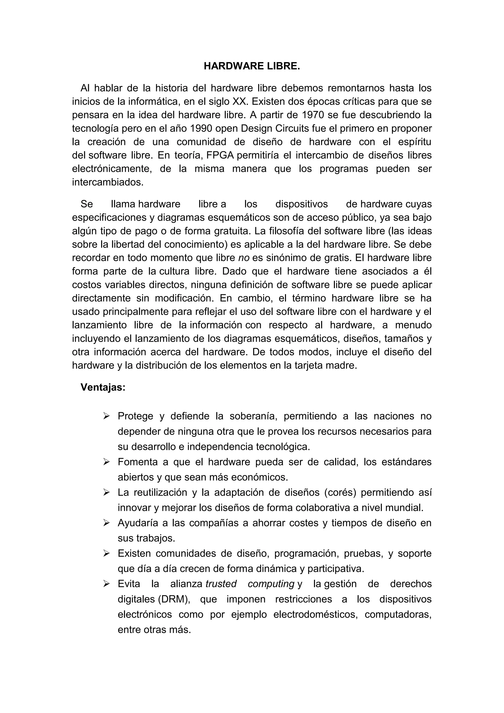 El documento habla sobre el hardware libre. Explica que la idea del hardware libre surgió en la década de 1970 pero no fue hasta 1990 que Open Design Circuits propuso crear una comunidad de diseño de hardware siguiendo los principios del software libre. El hardware libre se refiere a dispositivos cuyas especificaciones y diagramas son de acceso público. Comparte la filosofía del software libre de que el conocimiento debe ser libre. Sin embargo, aplicar directamente las cuatro libertades del software libre al hardware es difícil dado que el hardware tiene existencia física