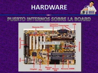 El hardware incluye todos los componentes físicos de una computadora como la caja, la placa madre, los procesadores, la memoria RAM, las tarjetas de video y de sonido, los discos duros y las unidades de CD/DVD. Estos componentes permiten el almacenamiento y procesamiento de información en una computadora.