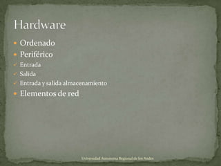 El documento describe los componentes principales de un ordenador y sus periféricos, incluyendo la placa base, procesador, memoria RAM, dispositivos de entrada como el teclado y ratón, dispositivos de salida como el monitor e impresora, y dispositivos de almacenamiento como el disco duro y unidades ópticas. También describe elementos de red como routers, switches y hubs.