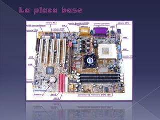 El documento describe los principales componentes de un ordenador, incluyendo el microprocesador, las memorias, el hardware como el disco duro y las unidades ópticas, y la placa base. También explica cómo se conectan los ordenadores en redes locales y amplias como Internet, transmitiendo la información de forma digital mediante paquetes de datos e identificando cada ordenador con una dirección IP.