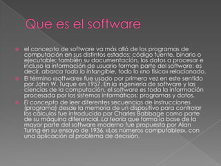 Este documento trata sobre el software y el hardware de las computadoras. Define el software como la información procesada por los sistemas informáticos, incluyendo programas y datos. Clasifica el software en tres tipos: software de sistema, software de programación y software de aplicación. Define el hardware como los componentes físicos de una computadora e identifica los componentes básicos como la CPU, memoria RAM, medios de entrada y salida de datos y almacenamiento. Explica los diferentes dispositivos de entrada, salida y mixtos que componen el hardware.