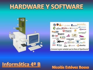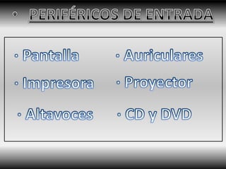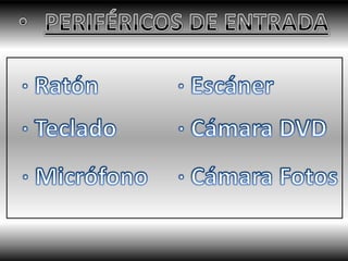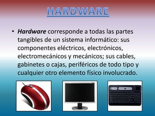 El documento define varios componentes hardware y periféricos de un sistema informático. Define el hardware como las partes físicas como componentes electrónicos, eléctricos y mecánicos. Define el software como el soporte lógico que permite realizar tareas específicas. Luego describe varios periféricos de entrada y salida como teclados, ratones, micrófonos, pantallas, impresoras y más.