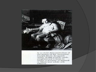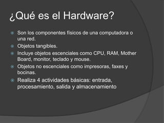 Este documento describe la evolución del hardware de las computadoras, desde los primeros cálculos manuales hasta los componentes modernos como la CPU, la memoria y las tarjetas. Comienza con los primeros dispositivos mecánicos como el ábaco y las calculadoras de engranajes. Luego describe los primeros computadores digitales como la ENIAC y cómo surgieron los componentes modernos como el microprocesador. Finalmente, explica cada uno de los componentes clave de una computadora moderna.
