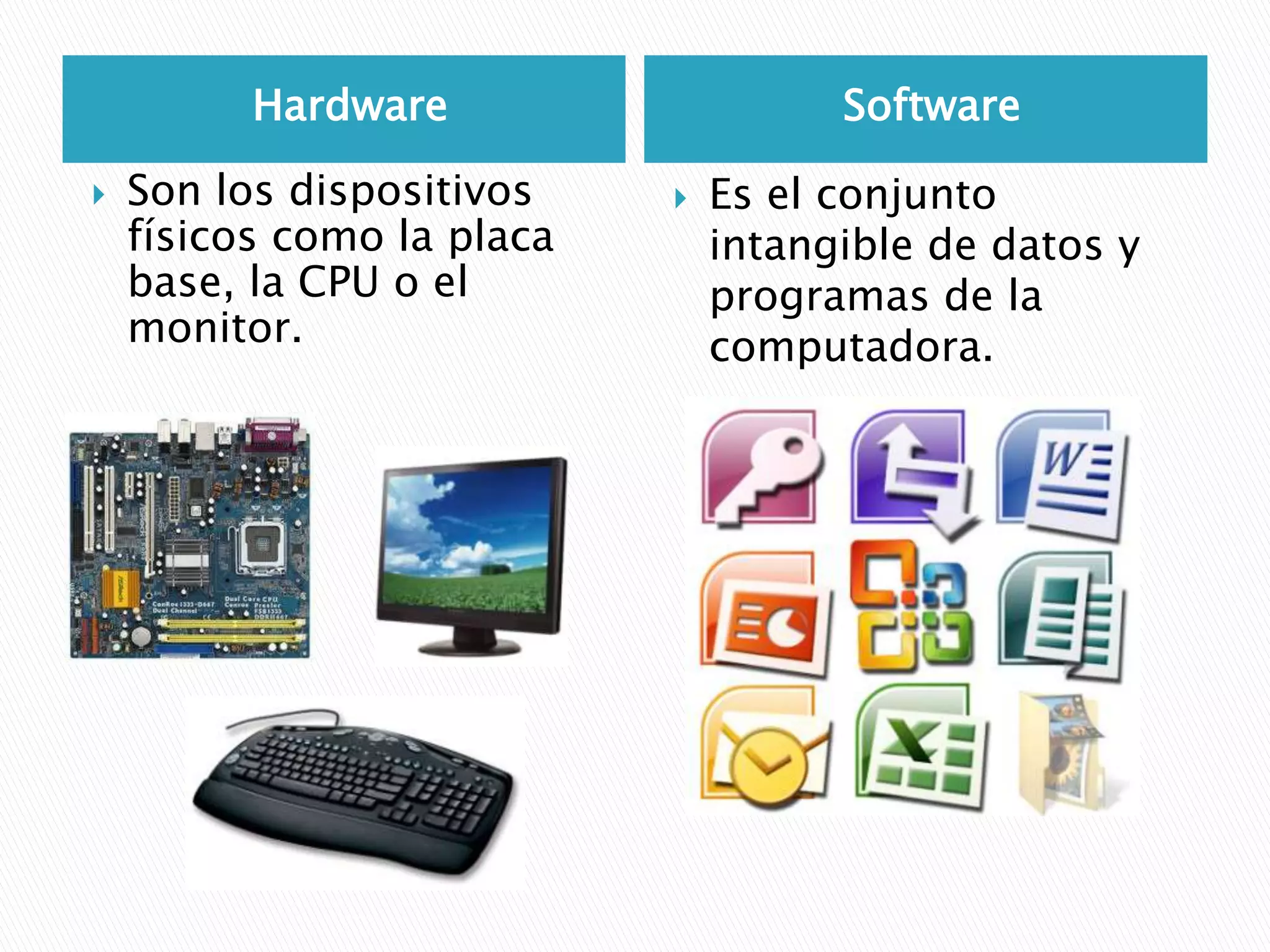 El documento describe los componentes fundamentales de hardware y software de una computadora. El hardware incluye dispositivos físicos como la placa base, CPU y monitor, mientras que el software son los programas y datos. El software envía instrucciones al hardware para hacer funcionar la máquina. Existen dispositivos de entrada, salida y almacenamiento, así como interfaces de usuario que permiten la interacción entre el usuario y la computadora.