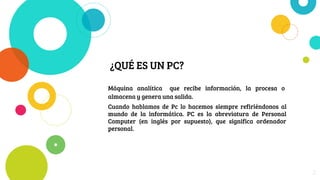 Este documento presenta información sobre computadoras personales (PC), incluyendo definiciones, tipos de hardware y software, y componentes clave. Explica que un PC es una máquina que procesa información y genera salidas, y que hay dos tipos principales: compatibles con IBM y Apple. También describe los componentes de hardware interno y externo de un PC, así como ejemplos de periféricos. Además, cubre conceptos como sistemas operativos, antivirus, firewalls y virus informáticos.