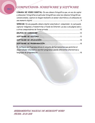 El documento describe los componentes básicos del hardware y software de una computadora. Explica que el hardware incluye la placa base, monitor, teclado, mouse y dispositivos complementarios como impresora, escáner y cámara. Además, detalla los grupos de hardware como dispositivos de entrada, chipset, CPU, unidad de control y almacenamiento. Por último, señala que el software incluye sistemas operativos, aplicaciones y programas de programación.