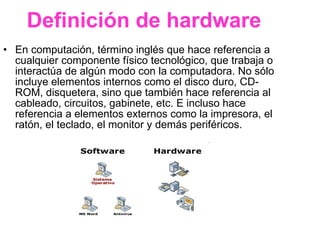 El software se refiere al conjunto de programas, procedimientos, reglas y datos asociados que forman parte de las operaciones de un sistema de computación, mientras que el hardware se refiere a los componentes físicos tecnológicos internos y externos que interactúan con la computadora, como el disco duro, circuitos, gabinete, impresora, ratón y monitor.