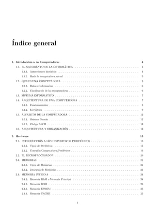 Este documento describe los fundamentos de hardware y software de las computadoras. Explica brevemente la historia de las computadoras y sus componentes clave como el microprocesador, la memoria y los periféricos. Luego entra en más detalle sobre cada uno de estos componentes hardware y los diferentes tipos existentes.