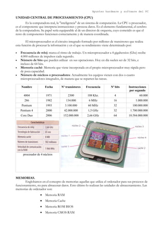 El documento proporciona información sobre cómo funciona un ordenador a nivel de hardware y software. Explica que un ordenador recibe información a través de periféricos de entrada que es procesada por la unidad central de procesamiento para obtener resultados que se muestran a través de periféricos de salida o se almacenan. También describe los principales componentes hardware de un ordenador como la CPU, memoria, unidades de almacenamiento y placa base, y cómo estos elementos trabajan juntos para que funcione el sistema.