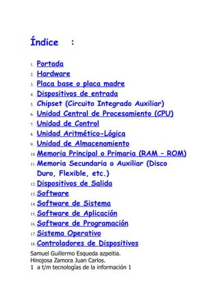 El documento proporciona una introducción general a los componentes de hardware y software de una computadora. Explica los principales componentes de hardware como la placa base, CPU, memoria y dispositivos de entrada y salida. También describe los diferentes tipos de software, incluidos el sistema operativo, software de aplicaciones y programas utilitarios.