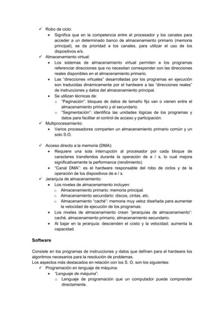 El documento describe los principales aspectos del hardware y software que son importantes para los sistemas operativos. En cuanto al hardware, se mencionan temas como la compaginación de memoria, registros de relocalización, interrupciones, dispositivos periféricos, temporizadores, canales de E/S, almacenamiento virtual y jerarquía de memoria. En el software, se cubren temas como la programación en lenguaje de máquina, ensambladores, compiladores, interpretadores y emulación.