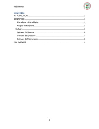 El documento describe los componentes de hardware y software de una computadora. Resume que la placa base aloja la CPU, memoria RAM, chipset y otros componentes clave. Explica que el software incluye sistemas operativos, controladores de dispositivos y programas de aplicación como word processors y hojas de cálculo. Divide el hardware en unidades de entrada, procesamiento, almacenamiento y salida y describe la función de cada una.
