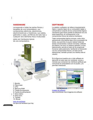 El hardware se refiere a las partes físicas de una computadora como componentes eléctricos, electrónicos y mecánicos, mientras que el software se refiere a los componentes lógicos como sistemas operativos y aplicaciones que permiten realizar tareas específicas. El hardware incluye elementos como la placa base, CPU, memoria y periféricos, mientras que el software incluye sistemas operativos y aplicaciones como procesadores de texto.