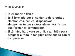 El documento describe los conceptos básicos de hardware y software. Define el hardware como los componentes físicos de un computador como circuitos, cables y dispositivos. El software se refiere a los programas ejecutables como algoritmos y estructuras de datos. También enumera los principales componentes de hardware de un computador típico e insta a los lectores a investigar sobre periféricos en grupos.